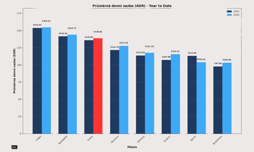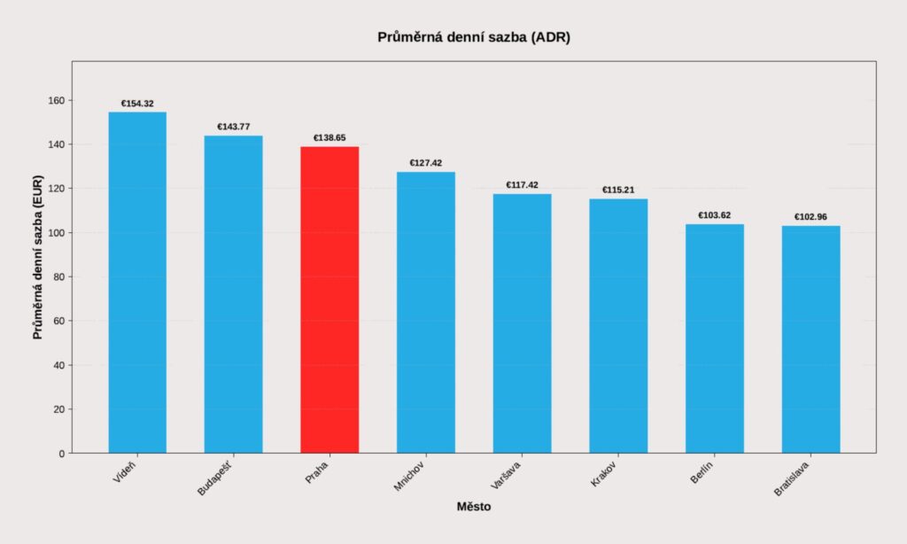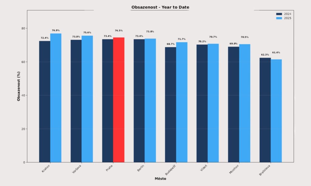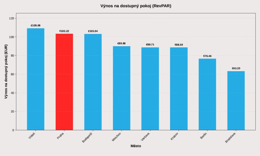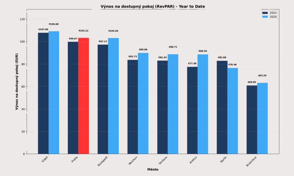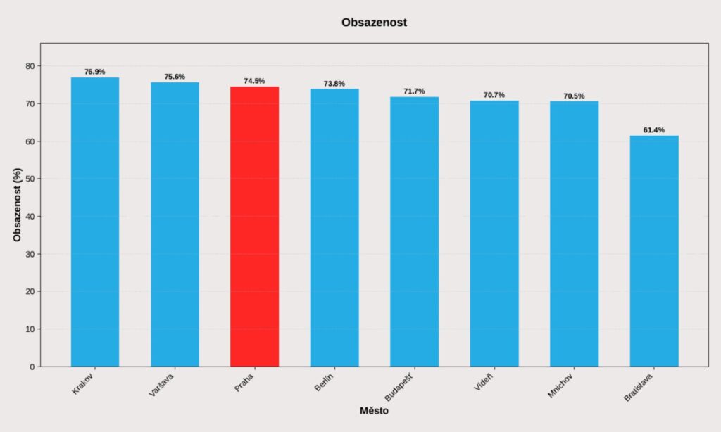 Praha si udržela třetí nejvyšší obsazenost ze sledovaných měst (74,5 %), těsně za Krakovem (76,9 %) a Varšavou (75,6 %). V kombinaci s průměrnou cenou 138,65 EUR, která ji řadí na třetí příčku po Vídni (154,32 EUR) a Budapešti (143,77 EUR), dosáhla Praha RevPAR ve výši 103,22 EUR, druhého nejlepšího výsledku hned po Vídni (109,08 EUR).