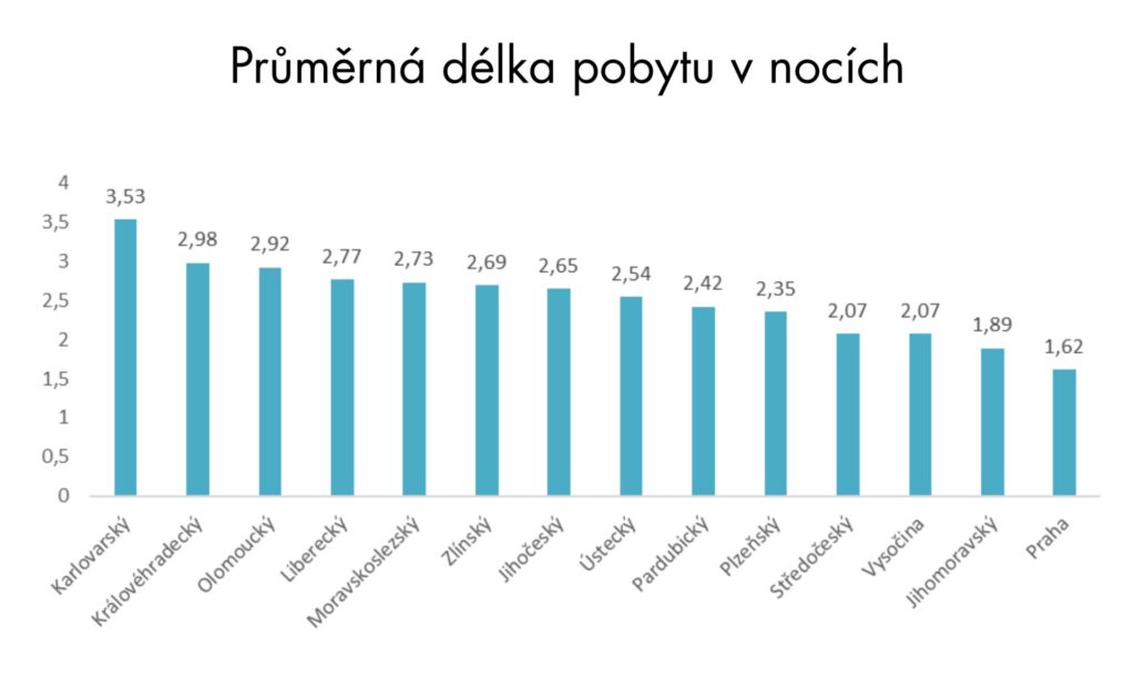 Průměrné délky pobytu v nocích ukazuje tento graf. Praha by si mohla nechat zdát o délce pobytu lázeňského Karlovarského kraje.