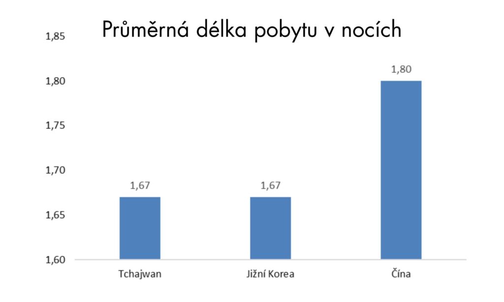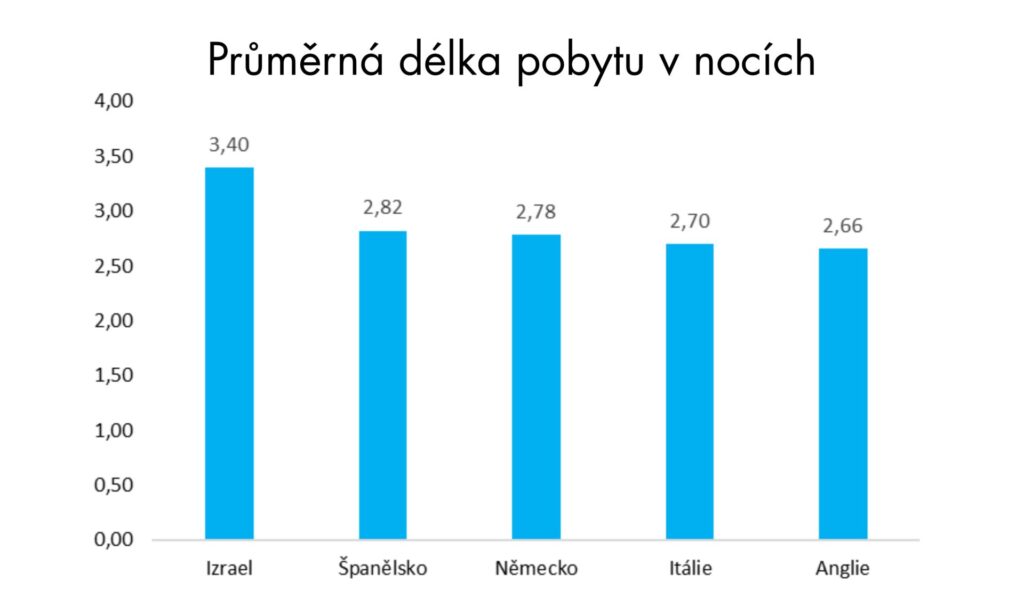 Naopak nejkratší délky pobytu v prvním pololetí 2025 patřily v Česku asijským národům (uvedeny národnosti, kde minimální počet přenocování byl 100 000).